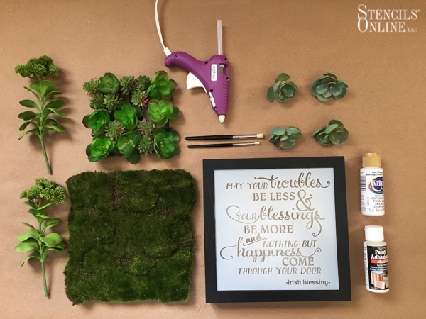 Invite happiness and the essence of spring into your home with this greenery filled shadowbox! Your guests will love seeing the succulents and moss that fill this box, and the Irish blessing will keep their days sunny & brighten up your day as well! You could place this sweet project just about anywhere in your house; it would look great on a side table or as the centerpiece on your coffee table!