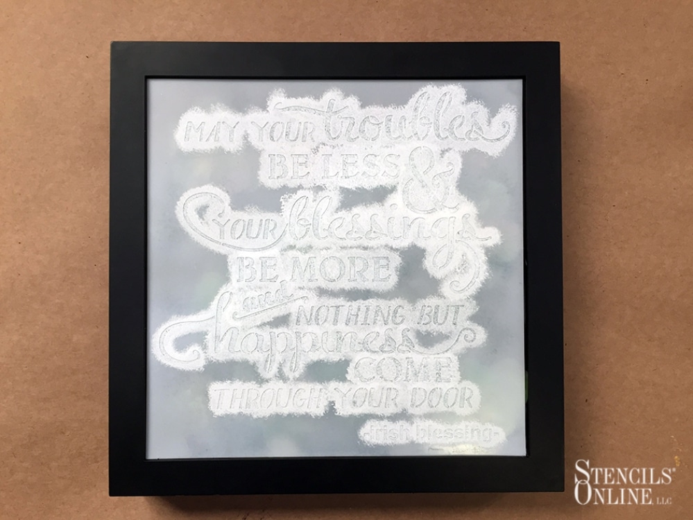- We applied two very light coats of paint to the stencil in order to fully cover the surface. After applying your second coat of paint, slowly remove the decorative stencil from the glass of the shadowbox to reveal your stenciled text!